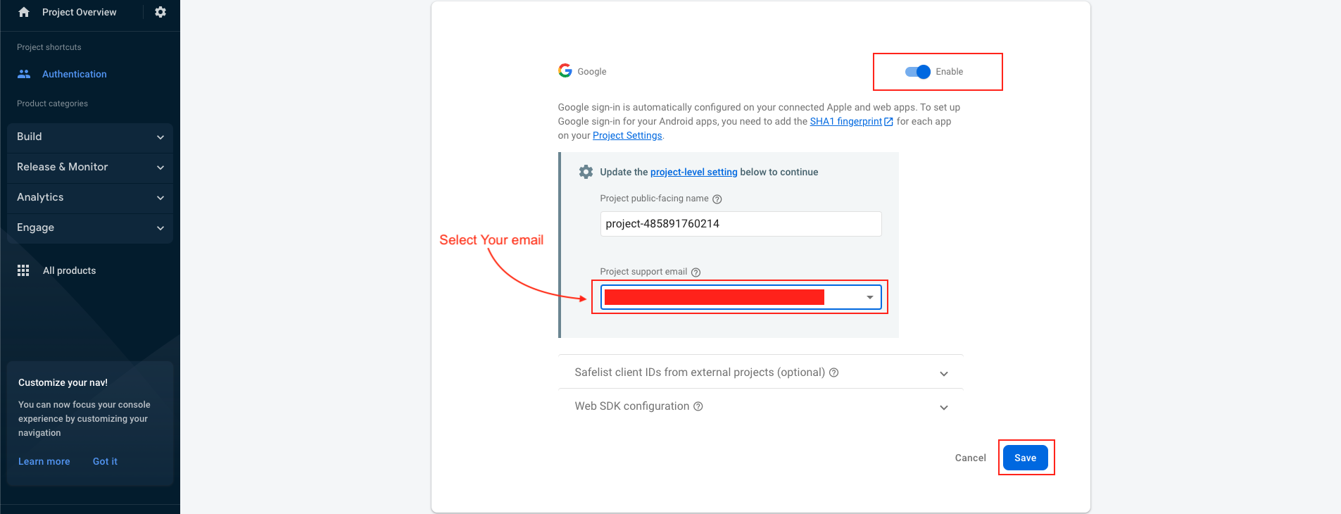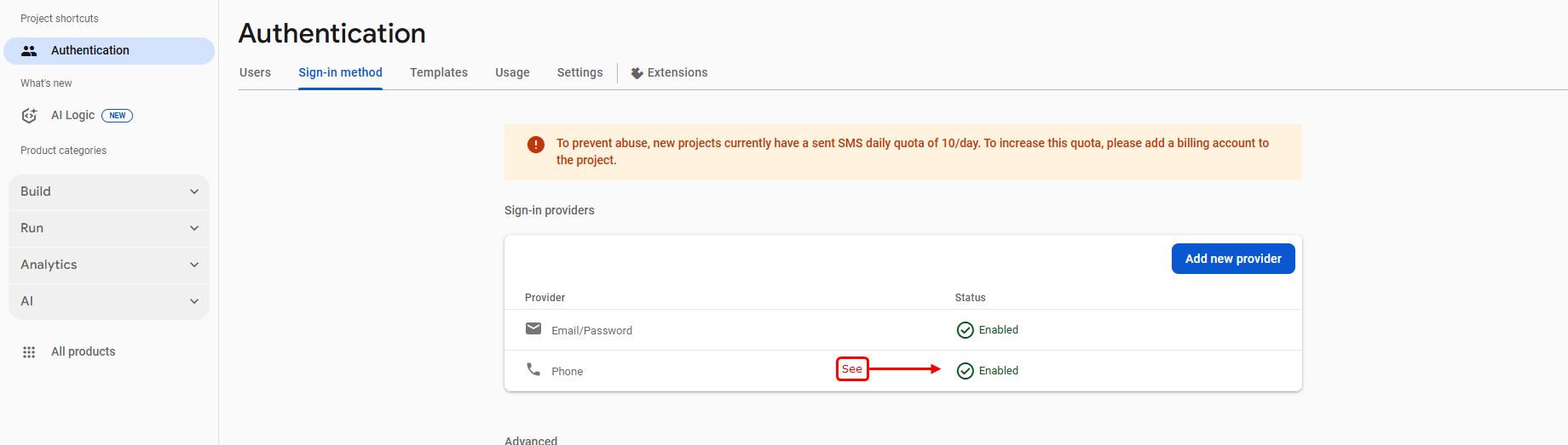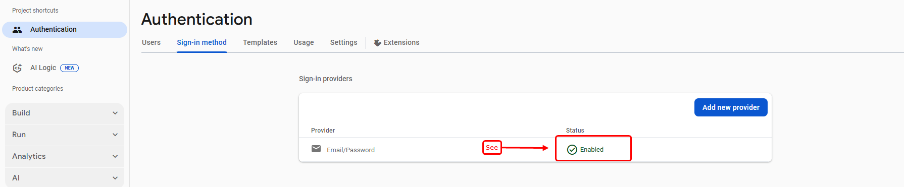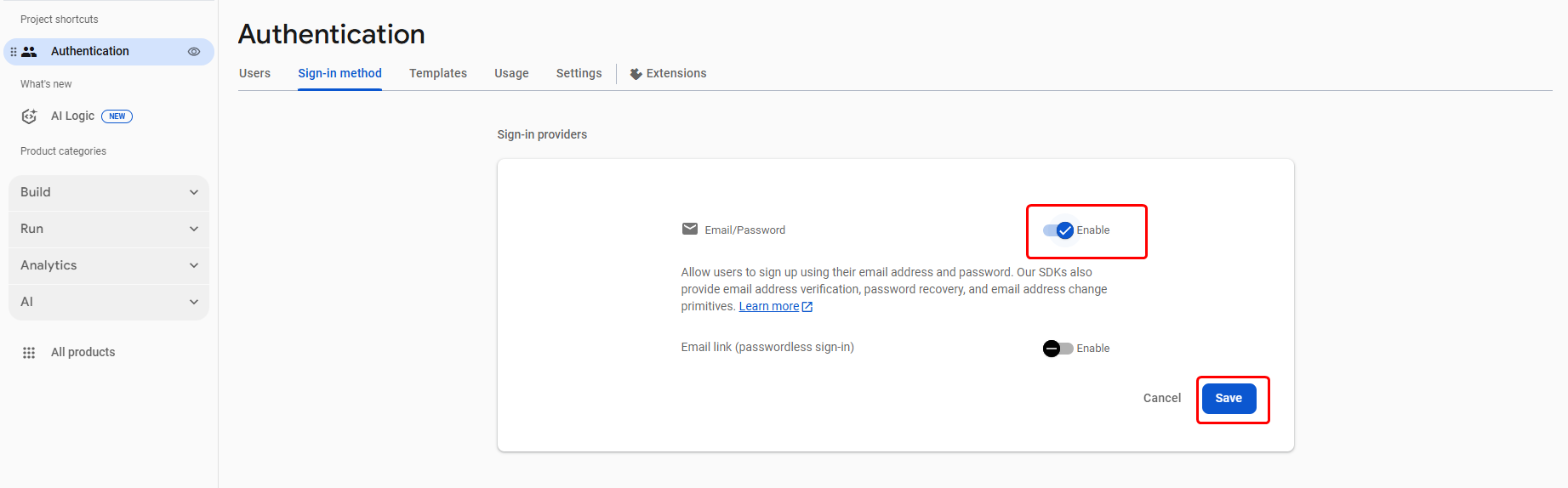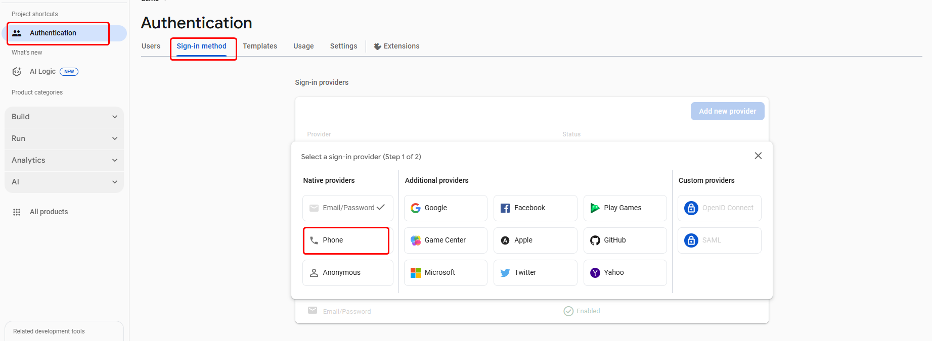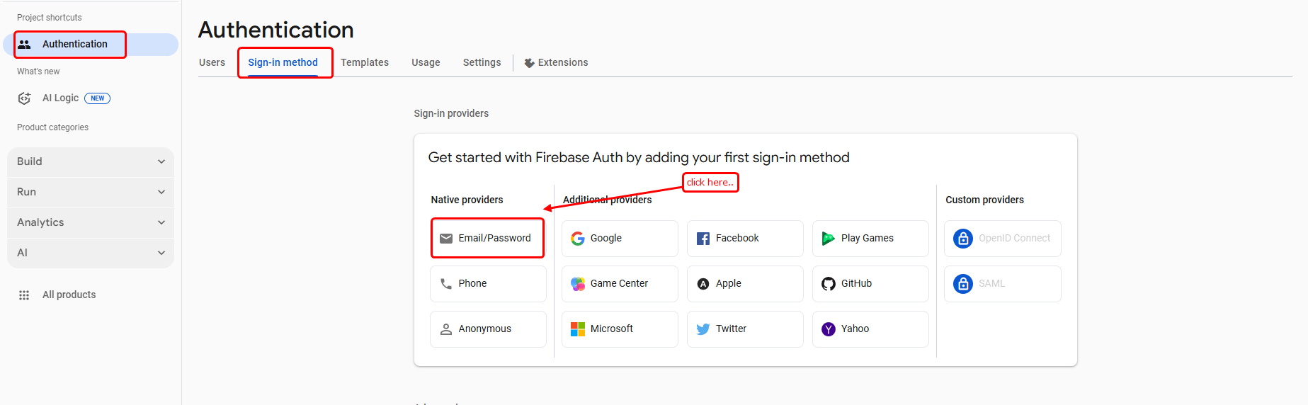 - Navigate to the "Authentication" section and select the "Sign-in method" tab.