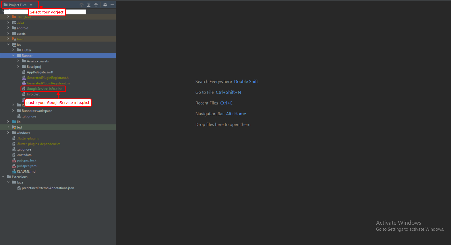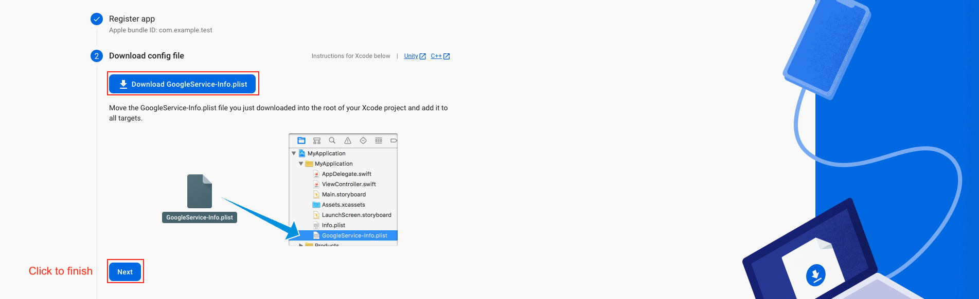 - Download the GoogleService-Info.plist file & move the GoogleService-Info.plist file you just downloaded into the root of your Xcode project and add it to all targets.