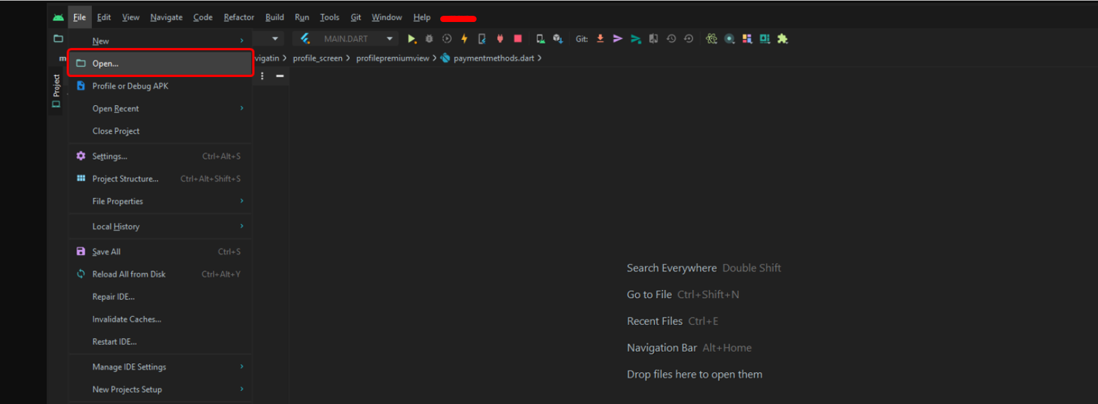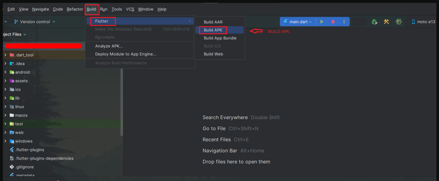 - Access the build options by following this path: "Build" > "Flutter" > "Build APK".