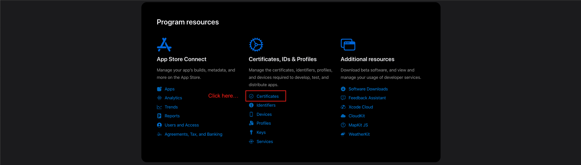 - Obtain a provider certificate from your developer account. This can be found in the "Certificates" section, as depicted in the image below.