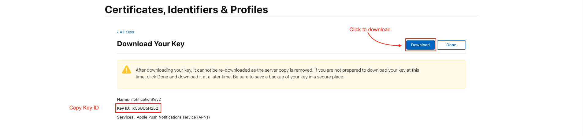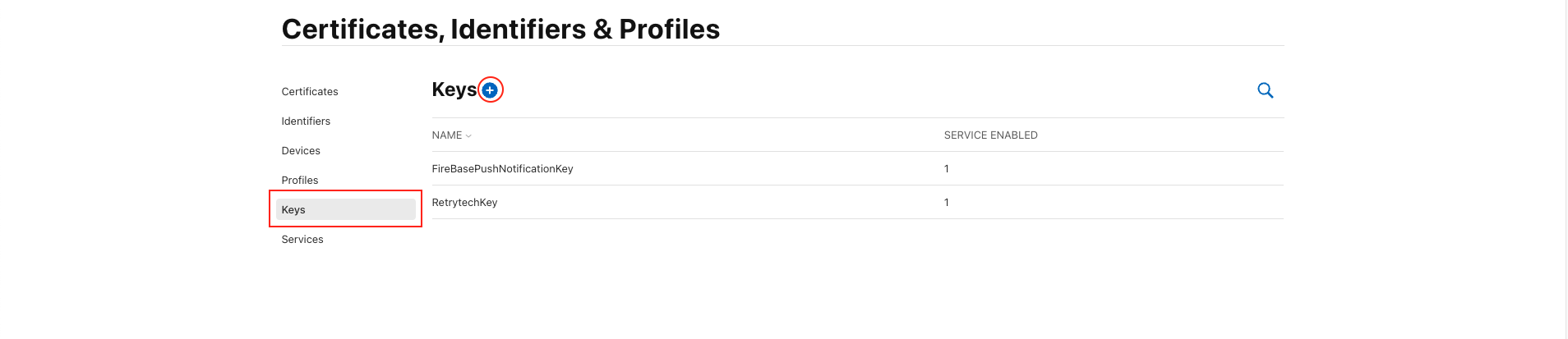 - A key can be generated which gives the FCM full access over the Apple Push Notification service (APNs). On the "Keys" menu item, register a new key. The name of the key can be anything, however you must ensure the APNs service is enabled.