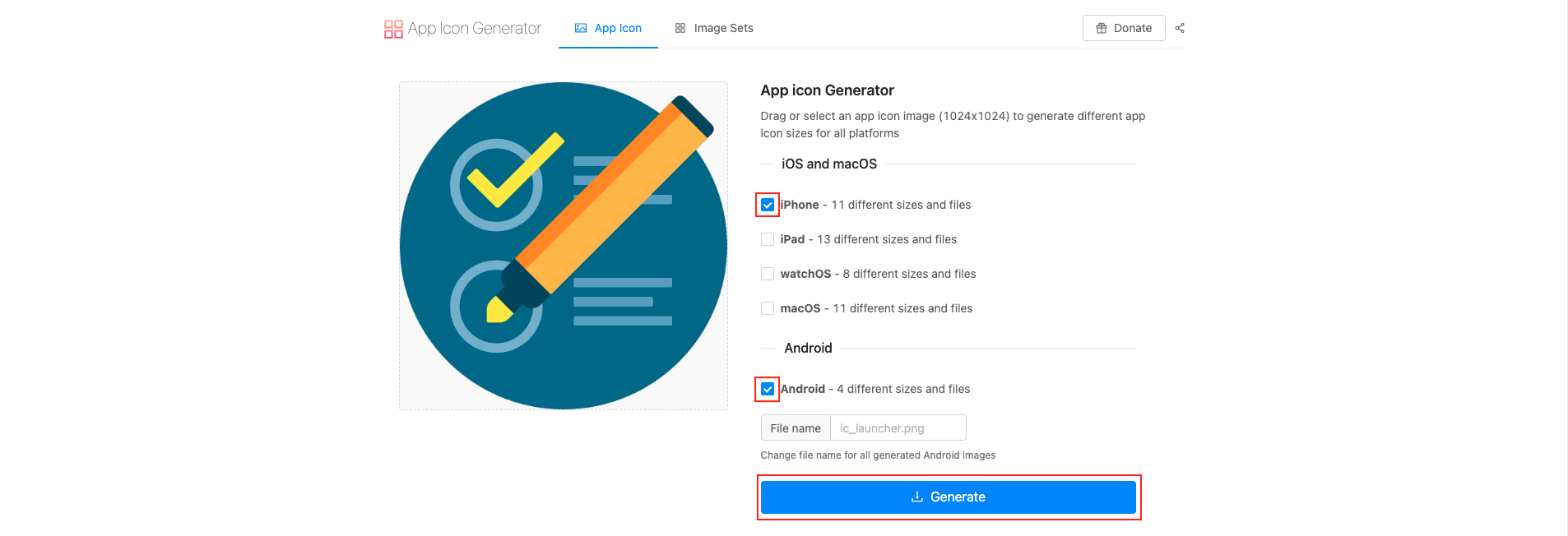 - Upload the icon image, select the desired options for iPhone and Android compatibility, and click on "Generate". This website will efficiently produce icons in multiple sizes for both platforms simultaneously.