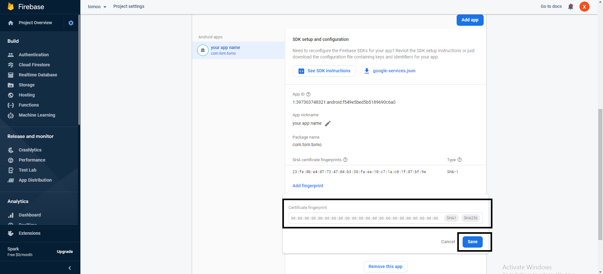 - Add your applicationid in the first field and SHA-1 to the third field as shown in the image below.