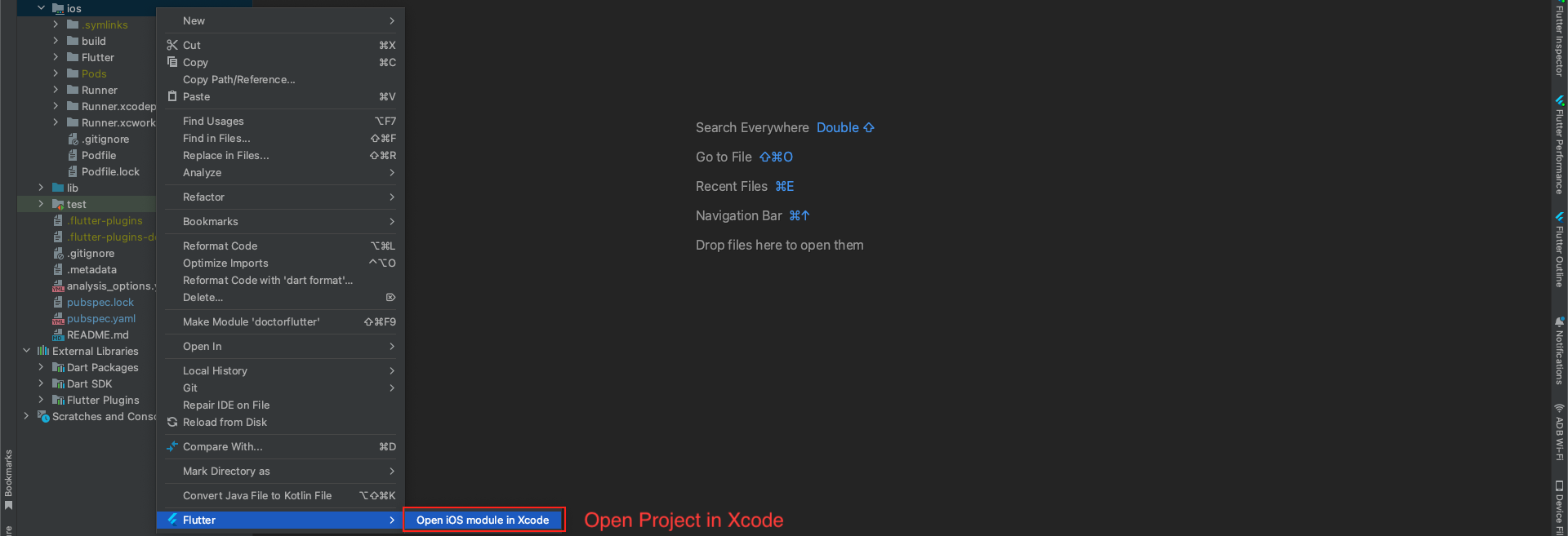 - Please initiate a right-click on the iOS directory, followed by selecting "Flutter" and then "Open iOS module in Xcode" to proceed further.