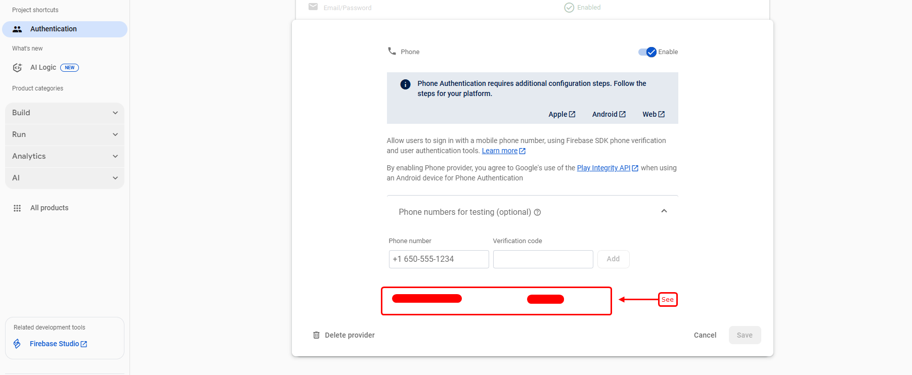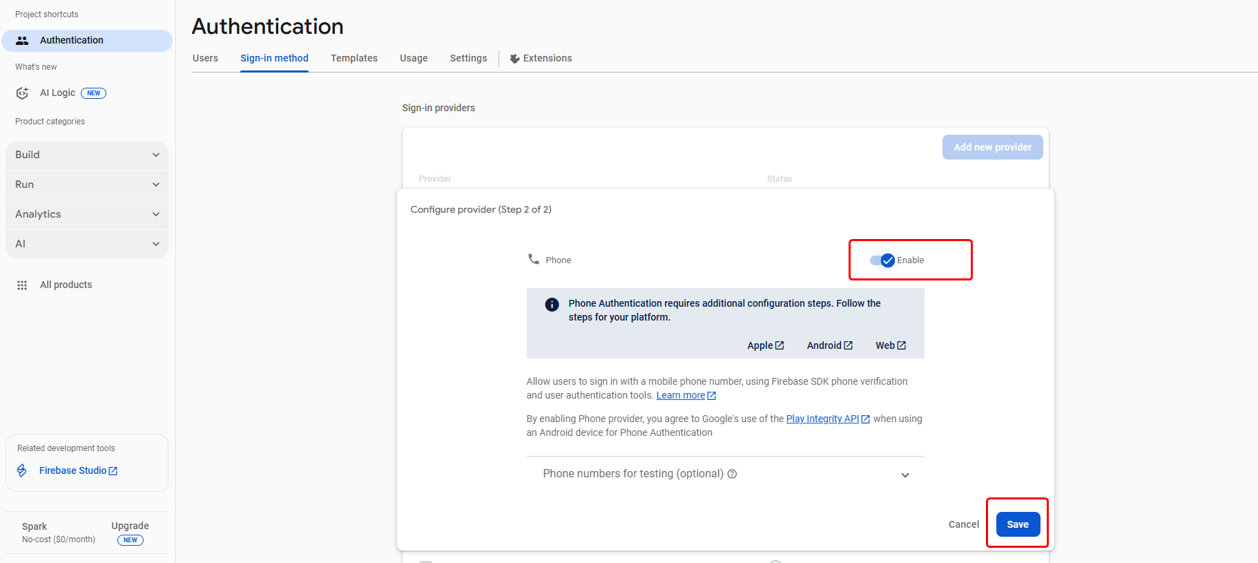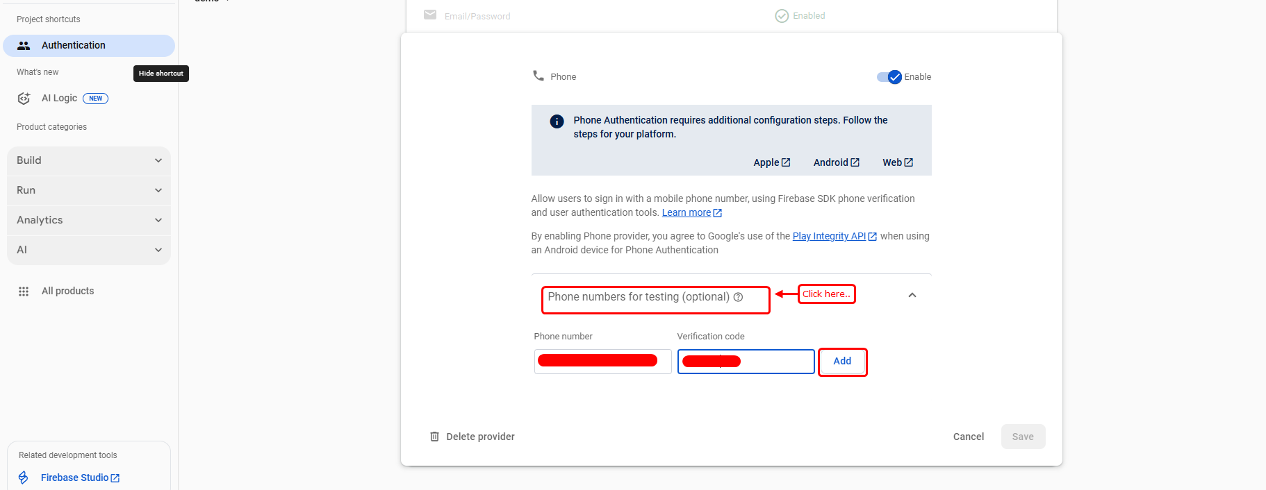 - You can add your test phone numbers along with their corresponding verification codes. Then, click the Add button to save them. This step is optional and useful for testing phone authentication without sending real SMS messages.