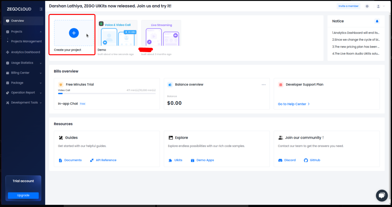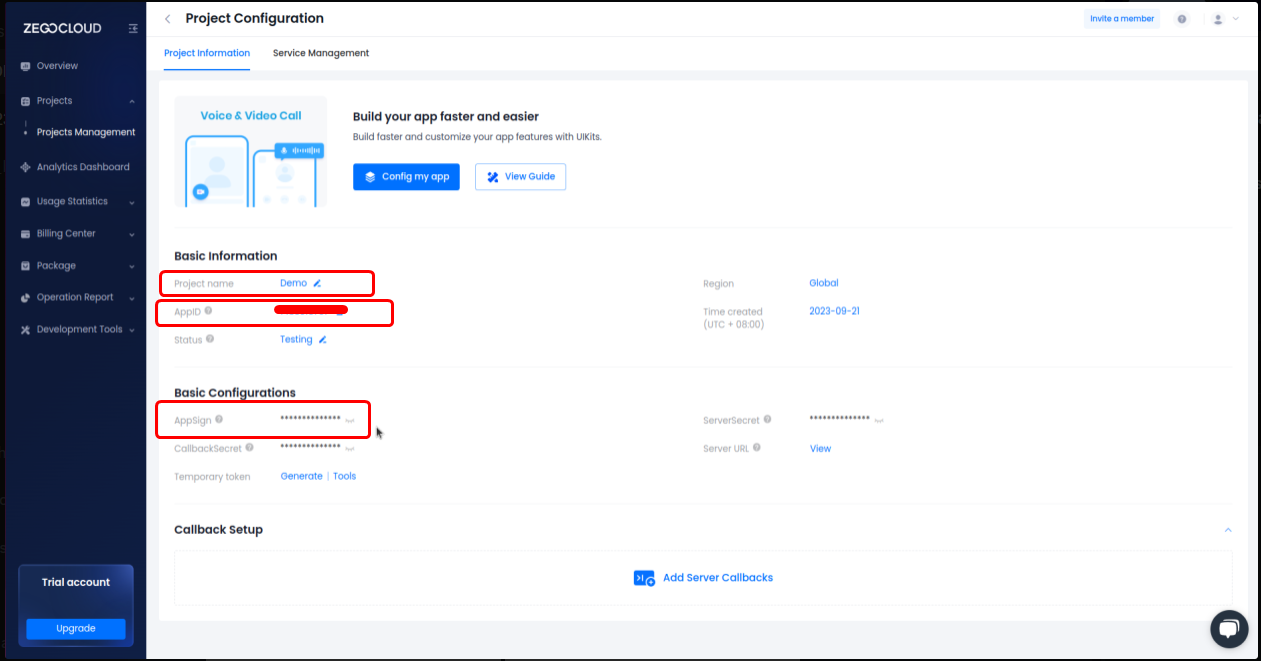 - To use the live-streaming function, you must generate a secret key in the Zego Cloud console.