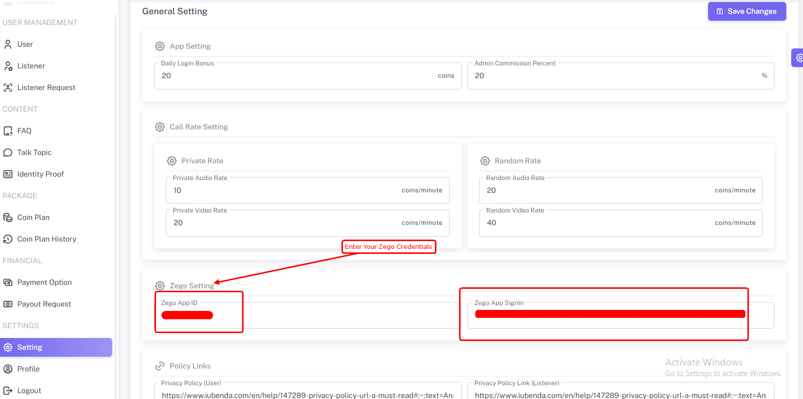 - Enter the Zego Cloud App ID and Zego Cloud App Sign In details in the admin panel under the settings section.